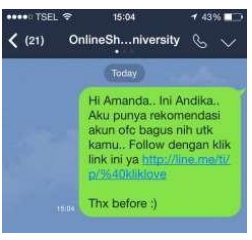 “Hi Amkamu, lagi apa? Aku punya official line account recommended buat kamu nih.. Memang akunnya masih baru, tapi kalo kamu cek timelinenya pasti kamu gak nyesel deh follow. Coba cek aja dulu, ini linknya ya Aku kasih.. http://……………….. Makasih ya udah mau bantu follow ” Kalau Kamu dapat pesan yang begitu friendly dan menyebut nama Kamu di awal, apakah Kamu akan dengan mudah skip pesan tersebut? Minimal Kamu akan balas pesan tersebut bukan? Karena itu bukan broadcast, namun PERSONAL. Dan setelah dia bilang OKE, 15 menit kemudian coba tanya lagi : “Sorry, tadi udah klik dan follow belum..? hehe”. Pokoknya Kamu pastikan dia follow deh, gak apa-apa ngotot dikit juga asal